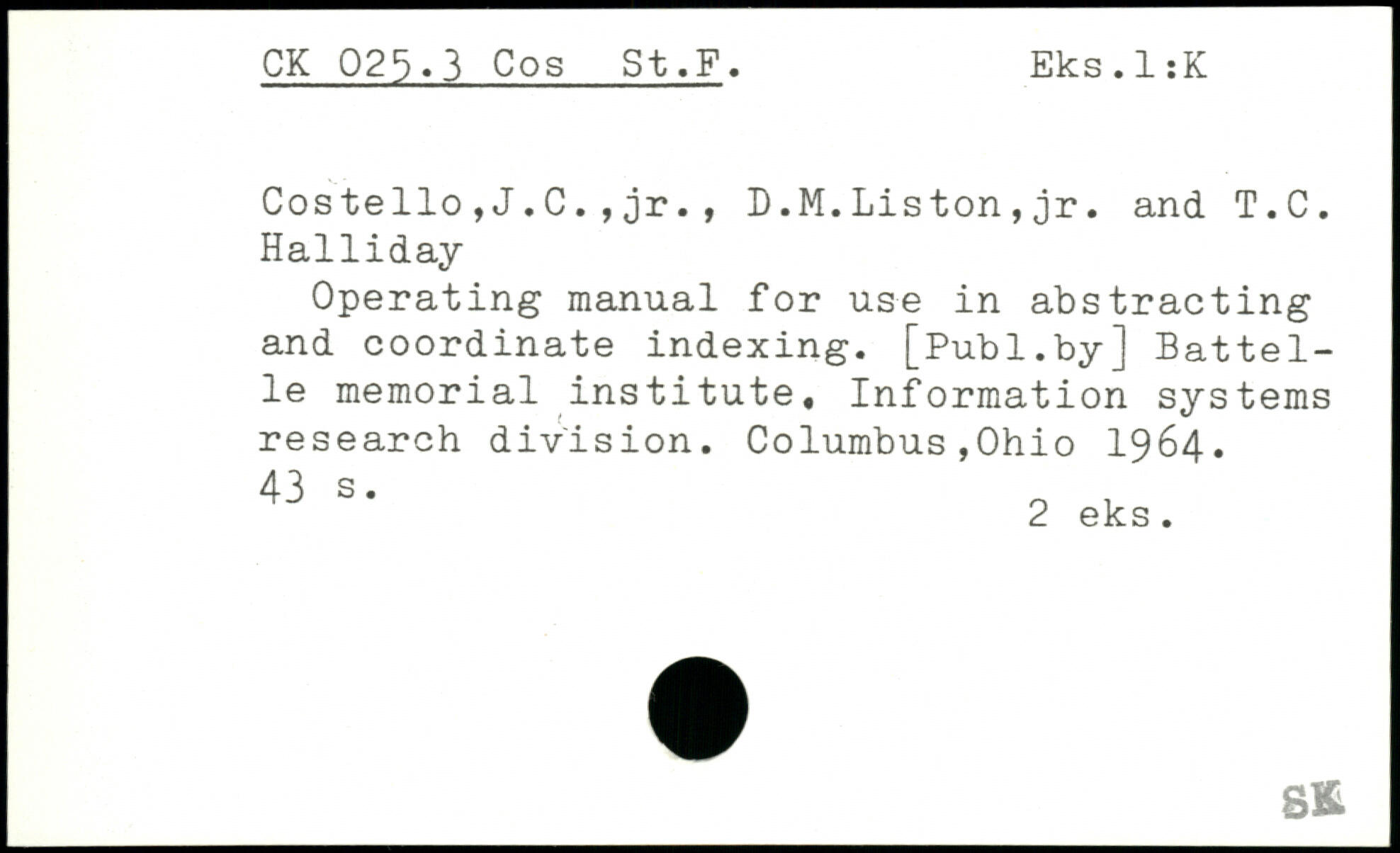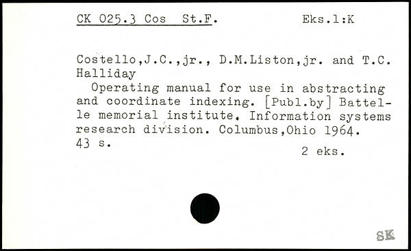Costello,J.C.,jr., D.M.Lis ton,jr. and T.C. Halliday Operating manual for use in abstracting and coordinate indexing.