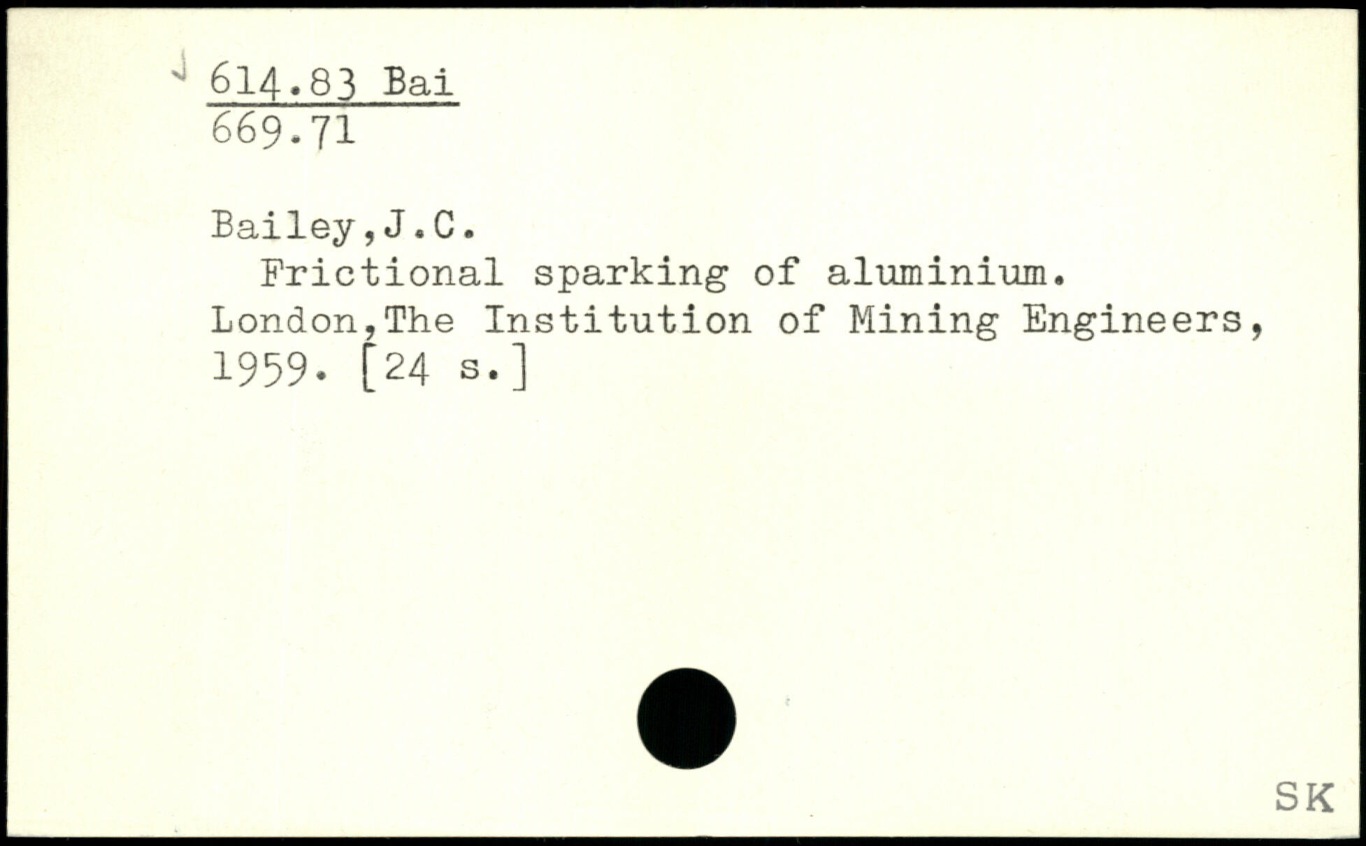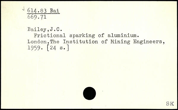 Frictional sparking of aluminium. London,The Institution of Mining Engineers, 1959. [