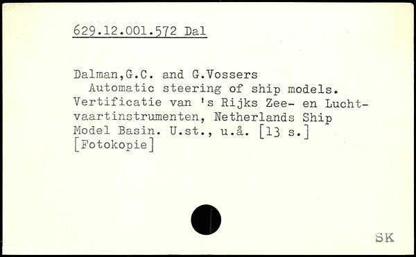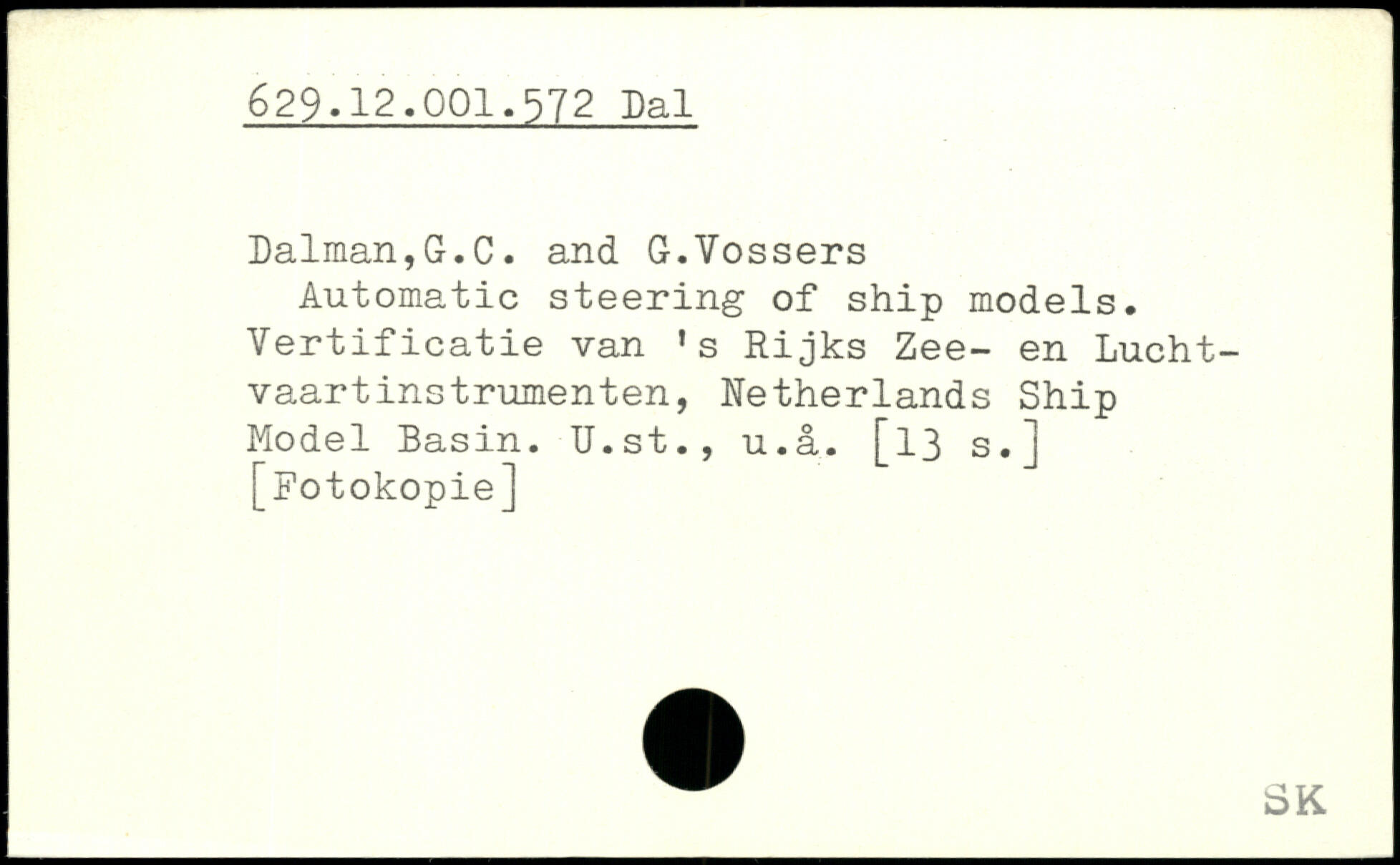 Automatic steering of ship models. Vertificatie van ' s Rijks Zee- en Lucht-vaartinstrumenten, Netherlands Ship Model Basin. U.st., u.å. [