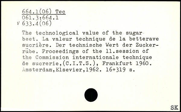 The technological value of the sugar beet. La valeur technique de la betterave sucrière. Der technische Wert der Zuckerrübe. Proceedings of the 11.session of the Commission internationale technique de sucrerie,(C.I.T.S.), Frankfurt 1960.