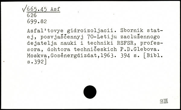 Asfal'tovye gidroizoljacii. Sbornik stat-ej, posvjascennyj 70-Letiju zacluzennogo dejatelja nauki i techniki RSFSR, profes-sora, dohtora techniceskich P-.D. Glebova. Moskva,Gosênergdizdat,1963.