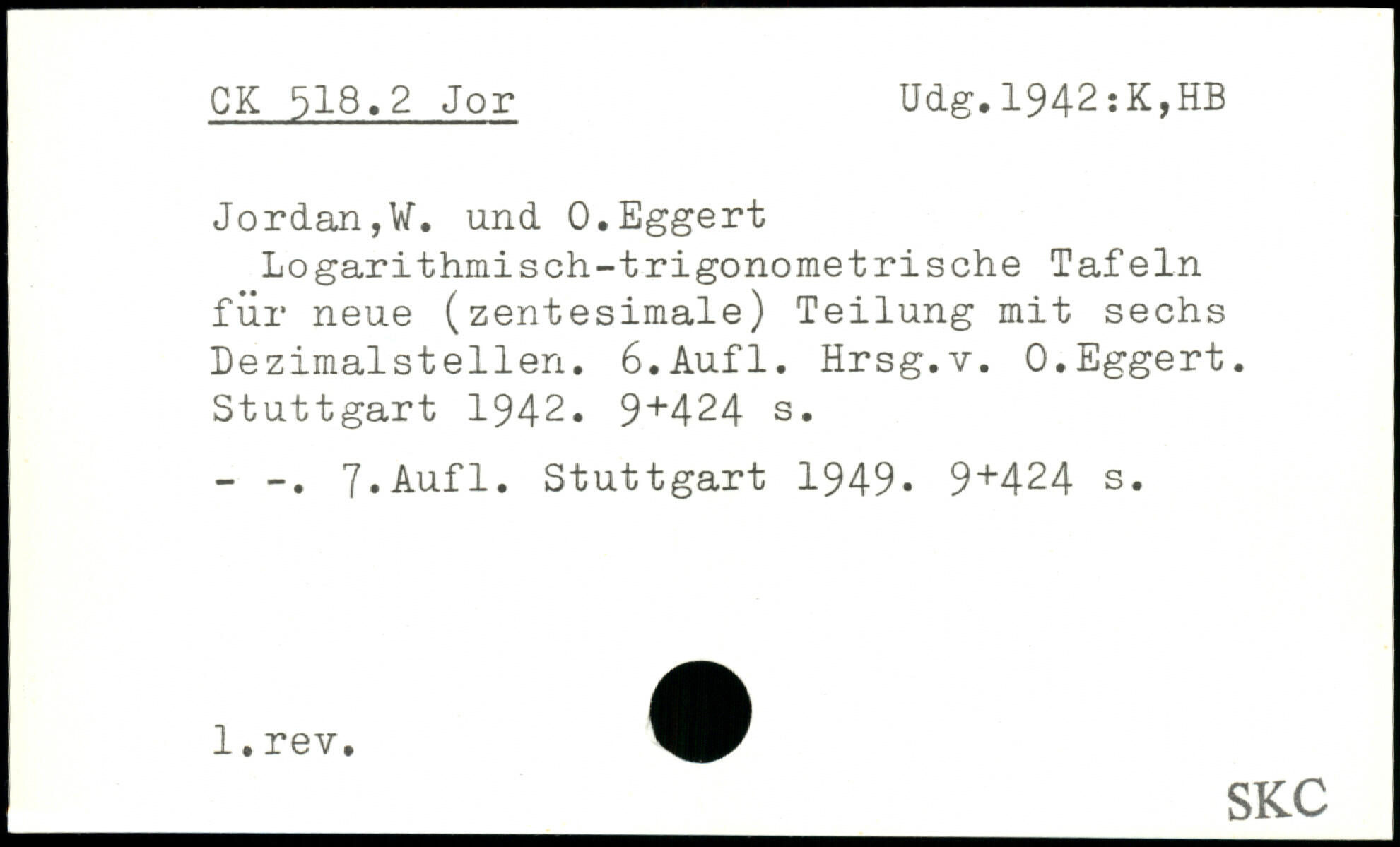 Jordan,VT. und 0.Eggert Logarithmisch-trigonometrische Tafeln für neue (zentesimale) Teilung mit sechs Dezimalstellen.