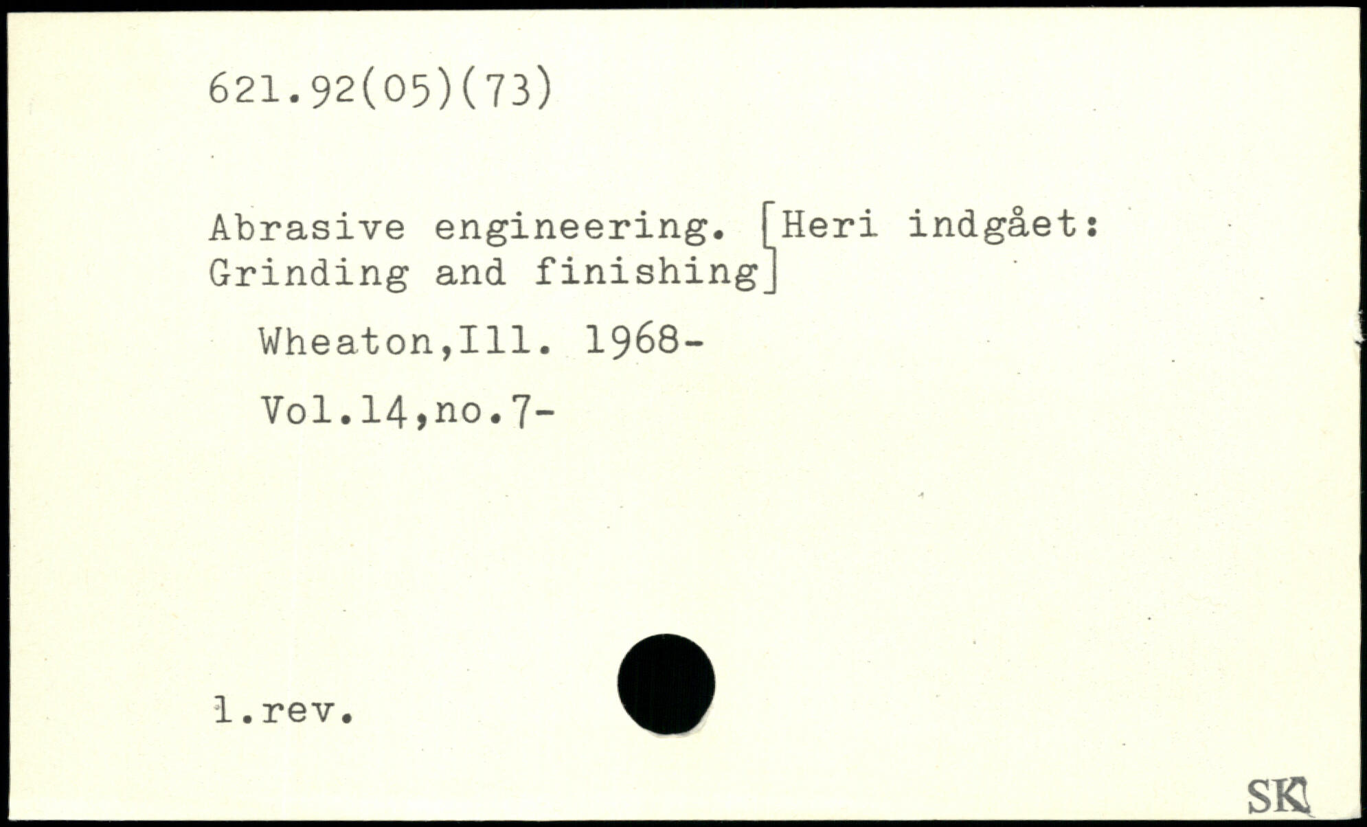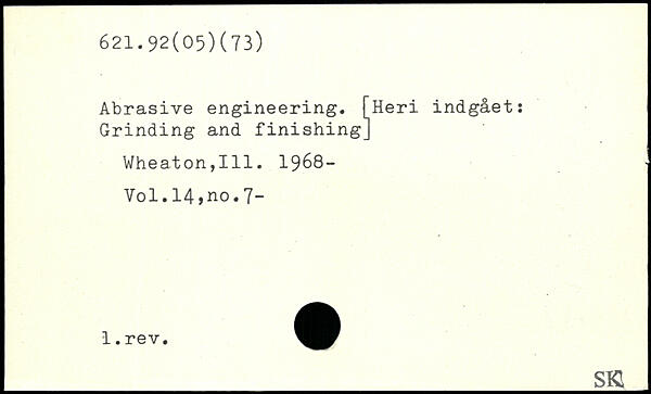 Abrasive engineering. [Heri indgået: Grinding and finishing] Wheaton,111. 1968- Vol.l4,no.7- _SKI
