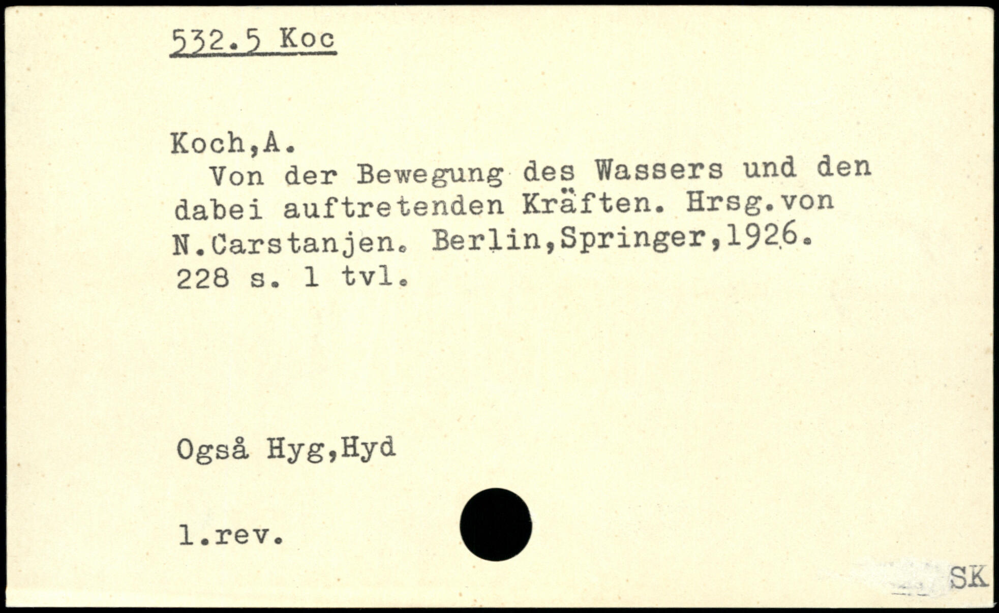 Von der Bewegung des Wassers und den dabei auftretenden Kräften. Hrsg.von N.Carstanjen. Berlin,Springer, 192.6.