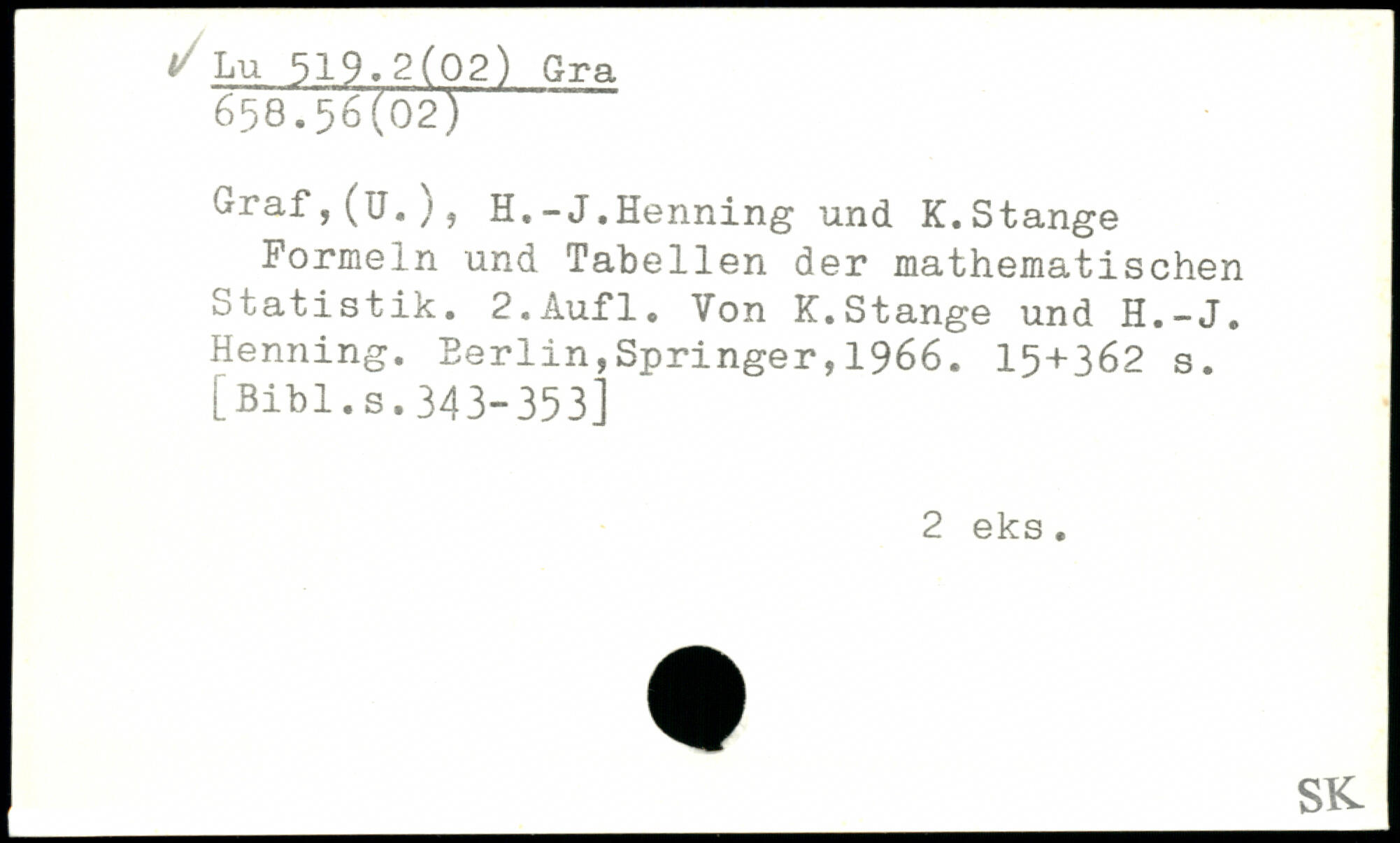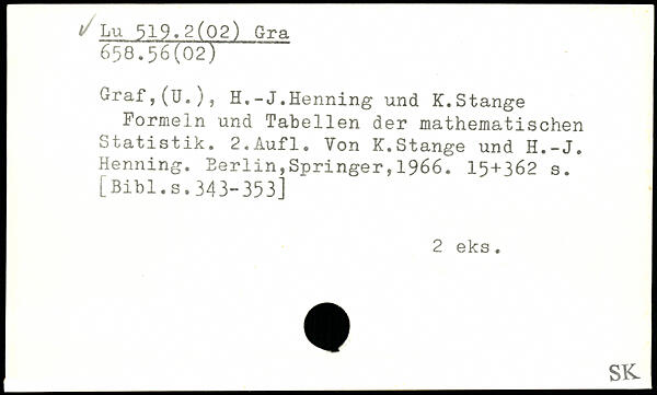 Formeln und Tabellen der mathematischen Statistik. 2,Aufl, Von K.Stange und H.-J, Henning.