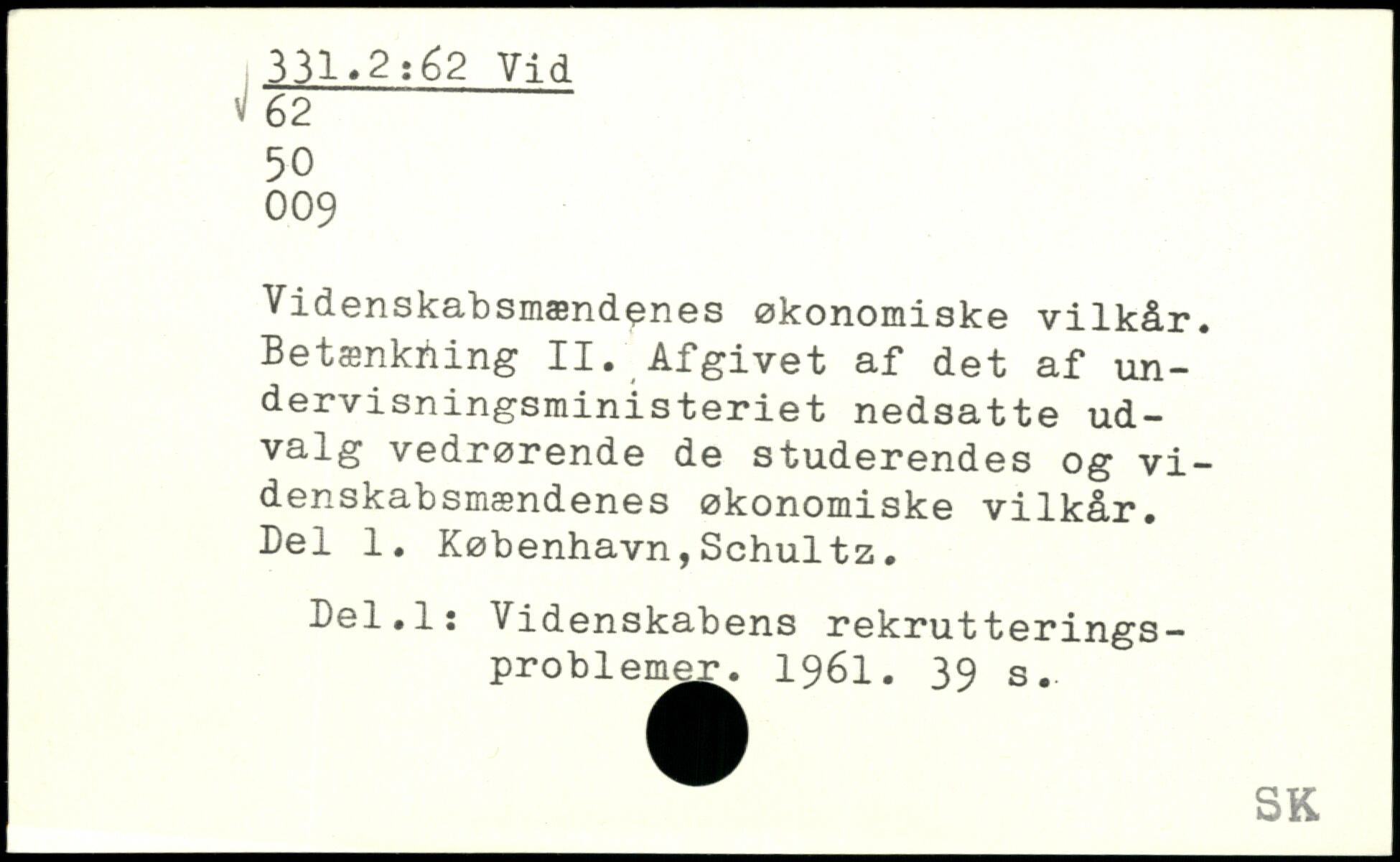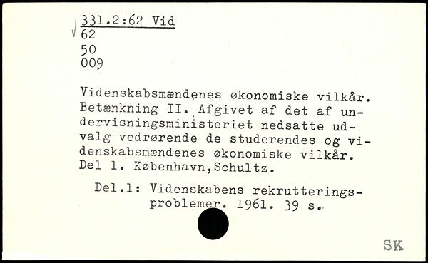 Videnskabsmændenes økonomiske vilkår. Betænkning II. Afgivet af det af undervisningsministeriet nedsatte udvalg vedrørende de studerendes og vi-denskabsmændenes økonomiske vilkår. Del 1. København,Schultz. Del.Is Videnskabens rekrutterings-problen^^ 1961.