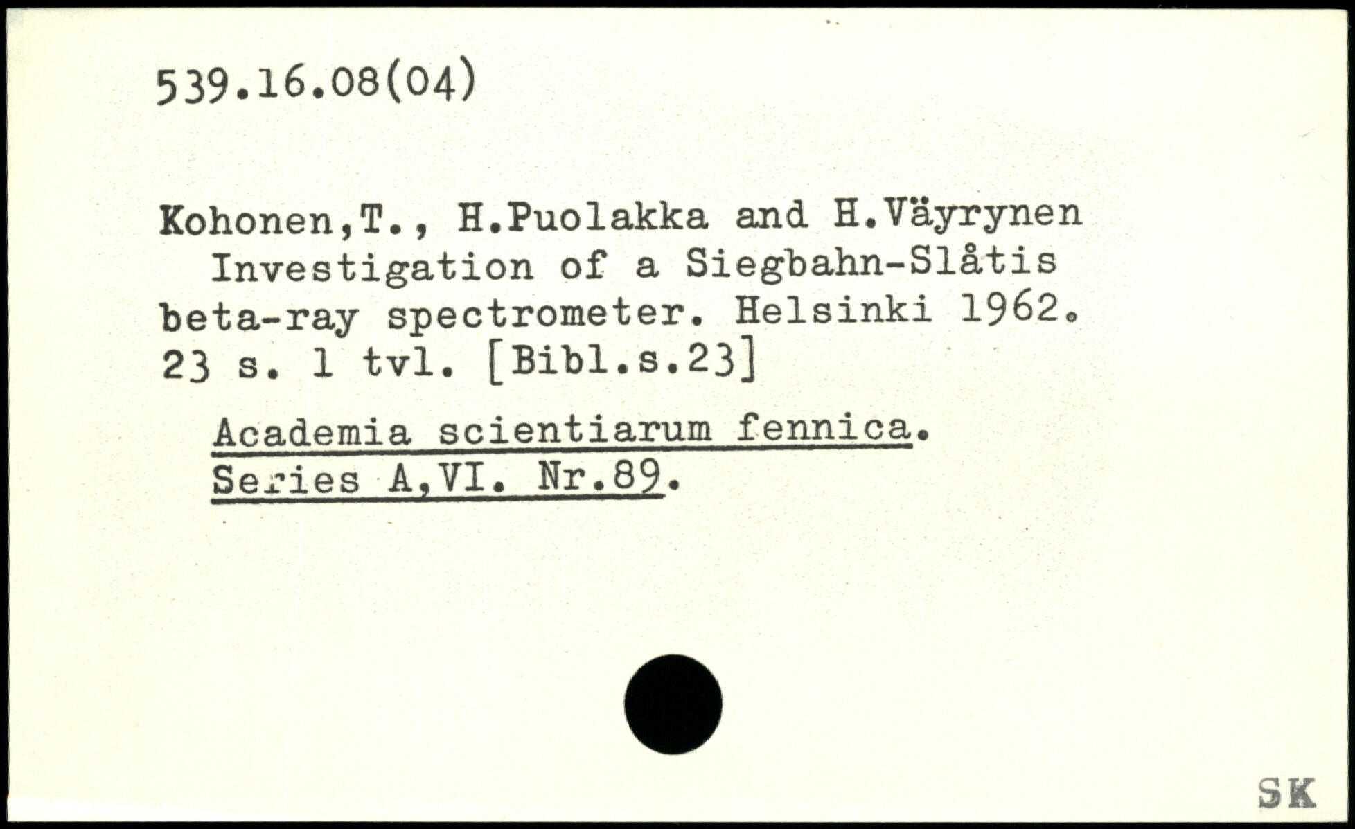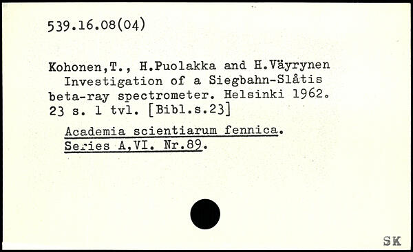 Kohonen,T., H.Puolakka and H.Våyrynen Investigation of a Siegbahn-Slatis beta-ray spectrometer.