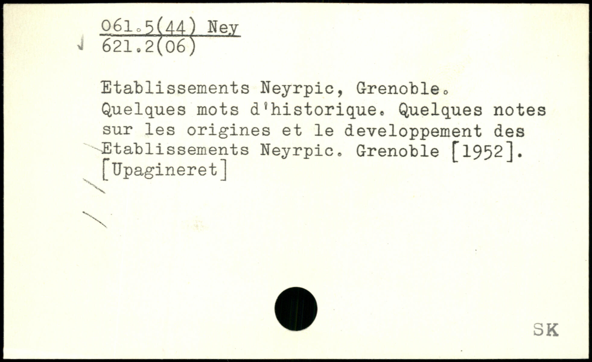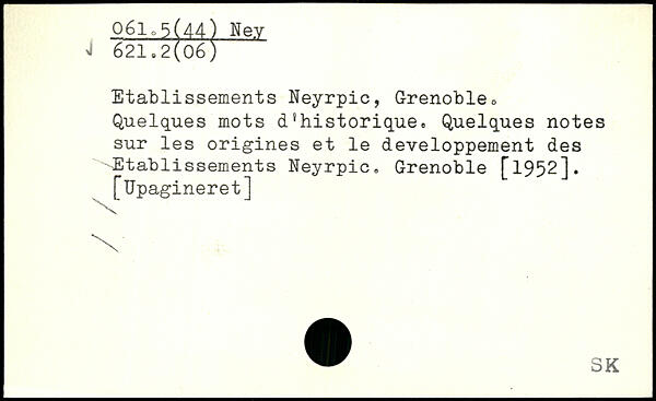 Etablissements Neyrpic, Grenoble, Quelques mots d’historique. Quelques notes sur les origines et le développement des Etablissements Neyrpic. Grenoble [1952]. [Upagineret]