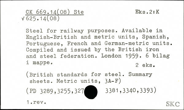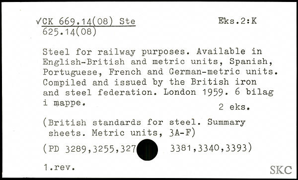 Steel for railway purposes. Available in English-British and metric units, Spanish, Portuguese, French and German-metric units. Compiled and issued by the British iron and steel federation.