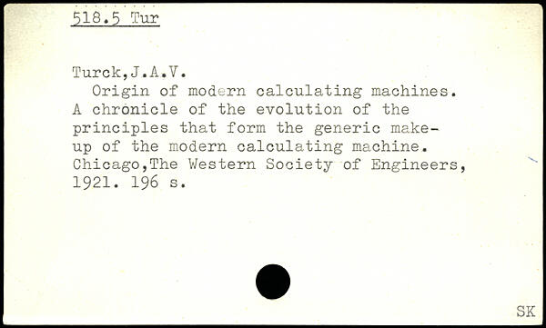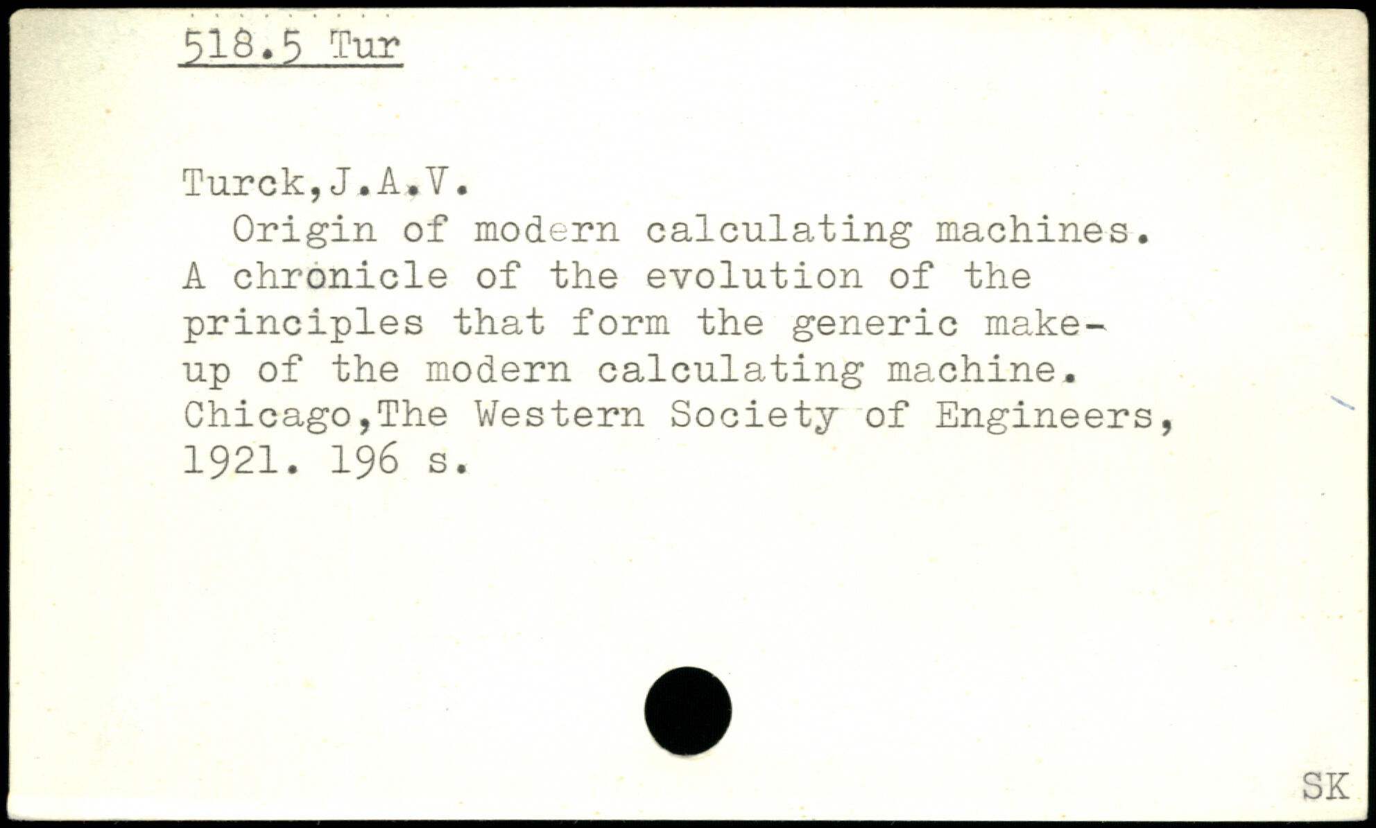 Origin of modern calculating machines. A chronicle of the evolution of the principles that form the generic makeup of the modern calculating machine. Chicago,The Western Society of Engineers, 1921.