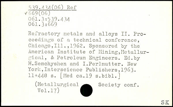 Refractory metals and alloys II. Proceedings of a technical conference, Chicago,111.,1962. Sponsored by the American Institute of IliningjMetallur-gical, & Petroleum Engineers. Ed.by M.Semchyshen and I.Perlmutter.
