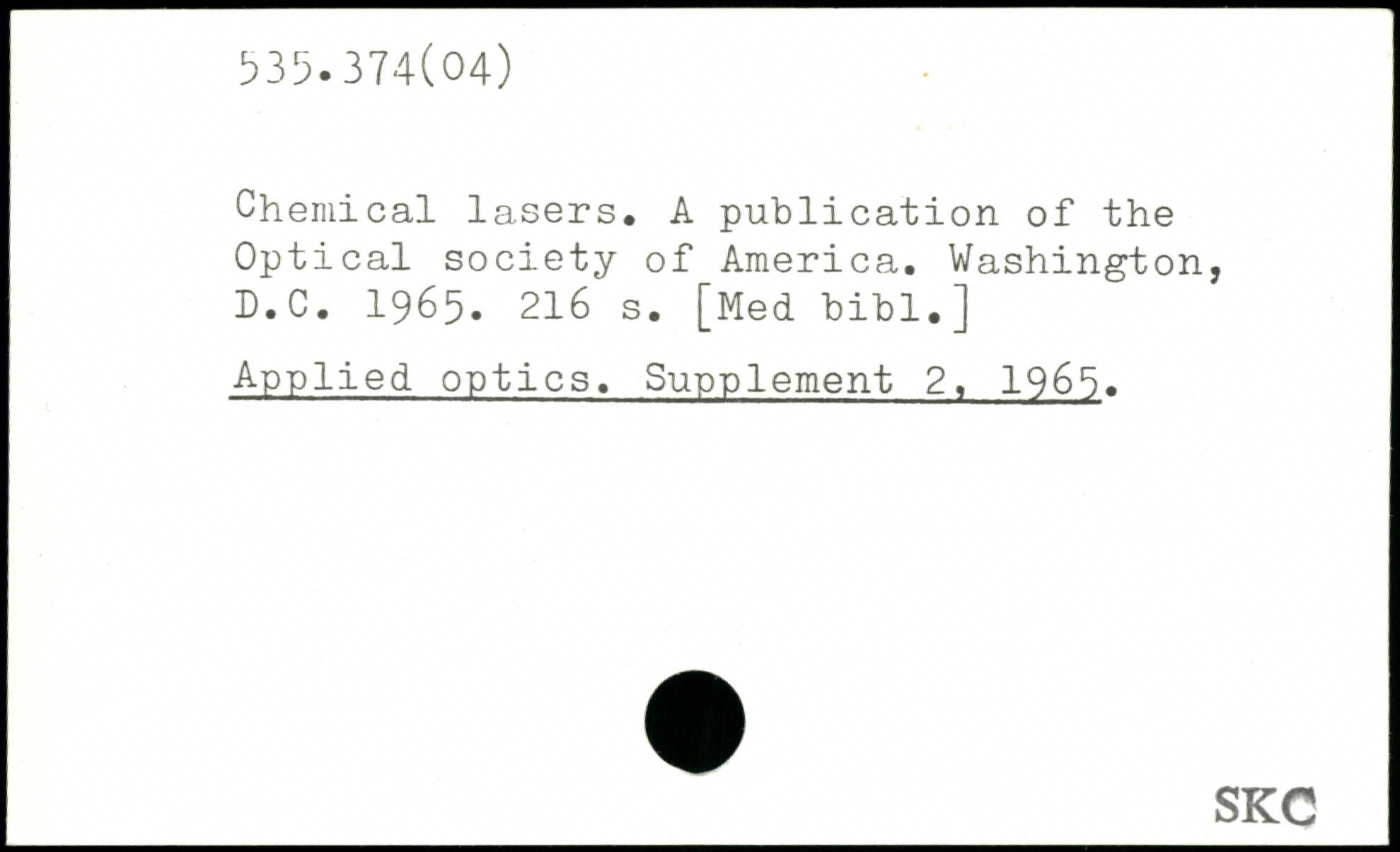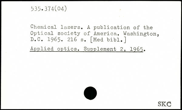Chemical lasers. A publication of the Optical society of America. Washington, f.C. 1965.