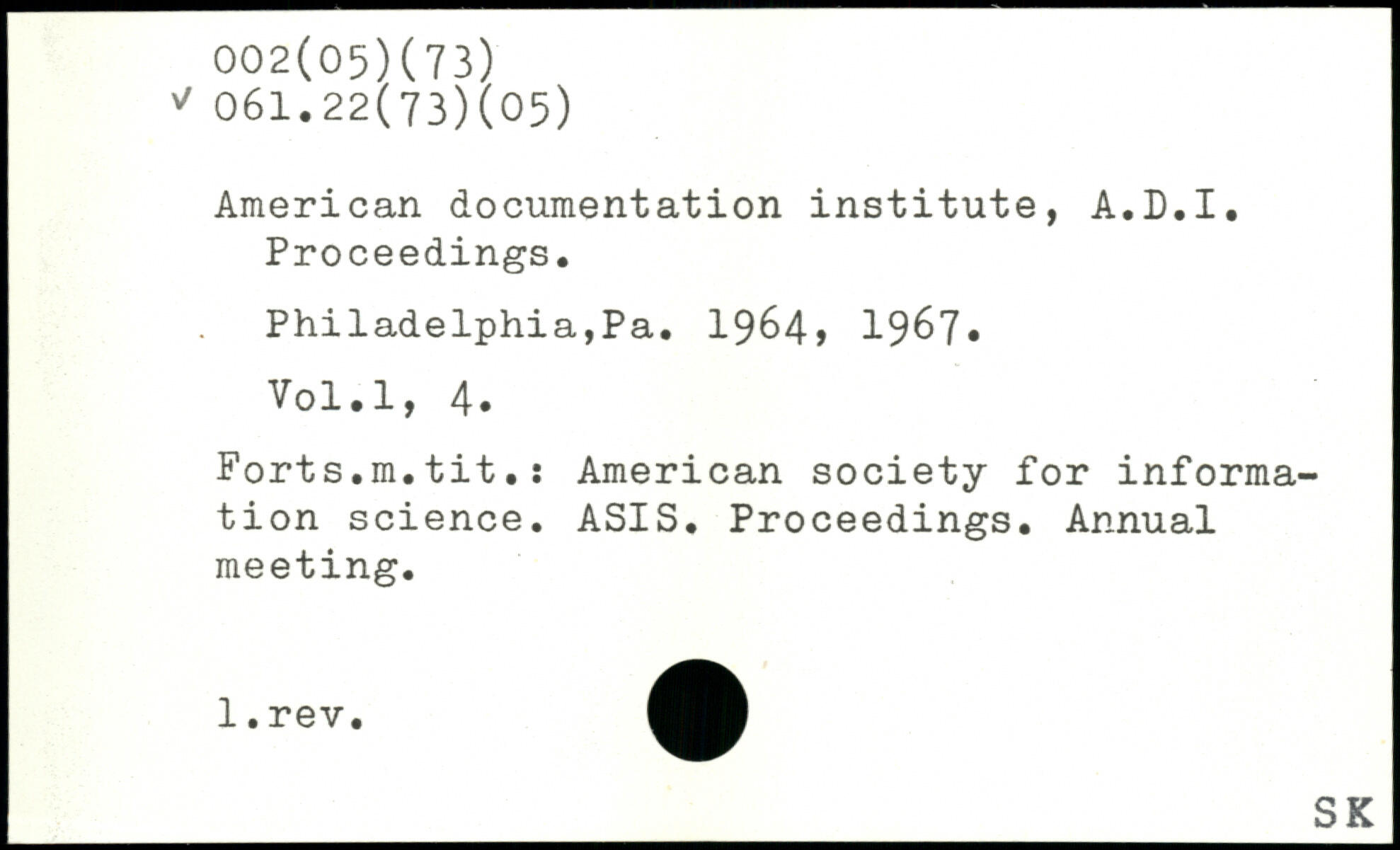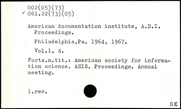 American documentation institute, A.D.I. Proceedings. Philadelphia,Pa. 19^4, 1967, Vol.l, 4. Forts.m.tit.: American society for information science. ASIS. Proceedings. Annual meeting.
