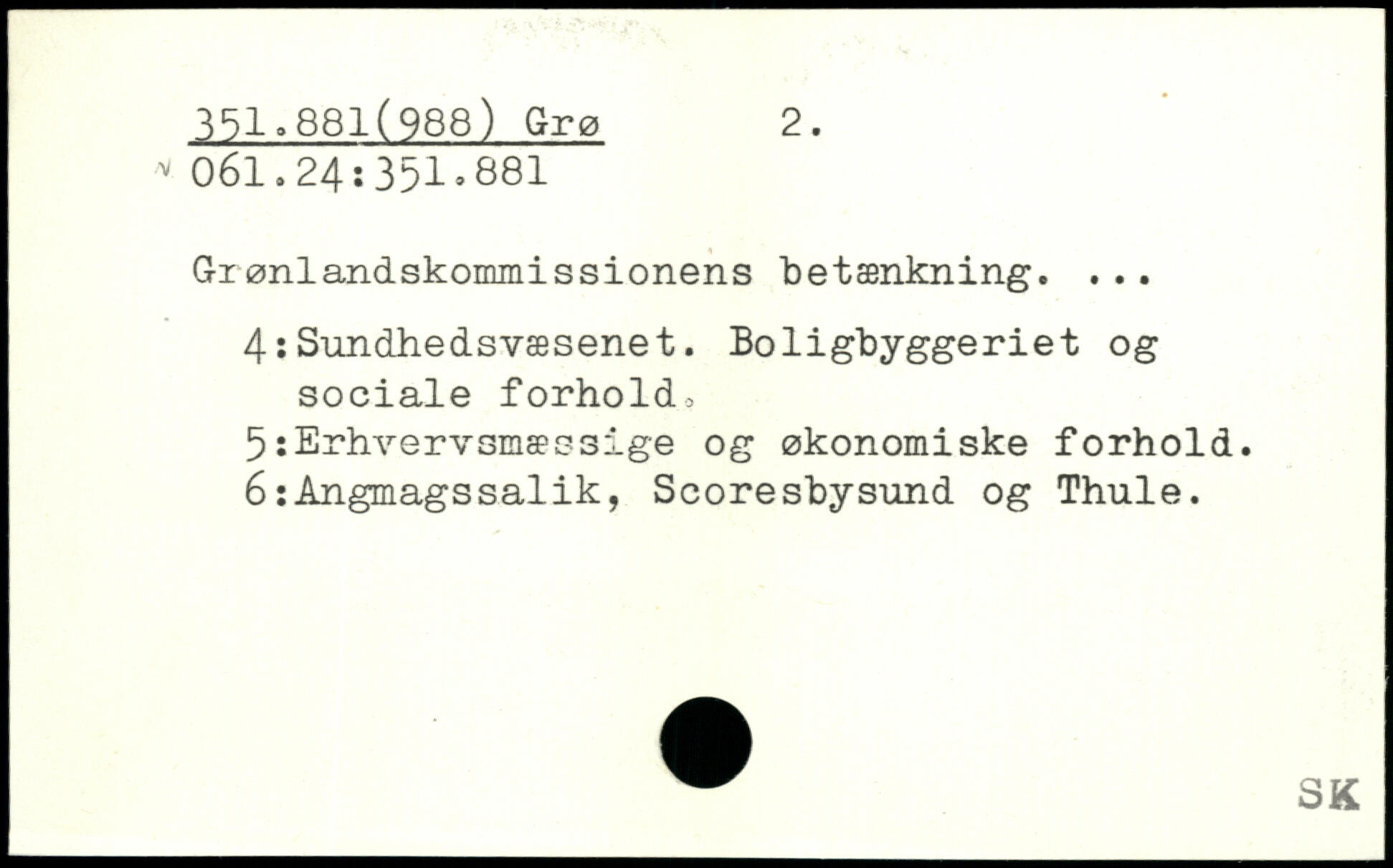 Giønlandskommissionens betænkning. ... 4:Sundhedsvæsenet. Boligbyggeriet og sociale forhold, 5:Erhvervsmæssige og økonomiske forhold. 6:Angmagssalik, Scoresbysund og Thule.