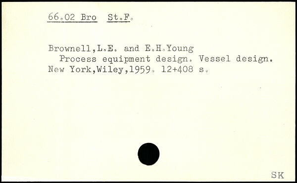 Brownell,L,E, and E,HoYoung Process equipment design, Vessel design.