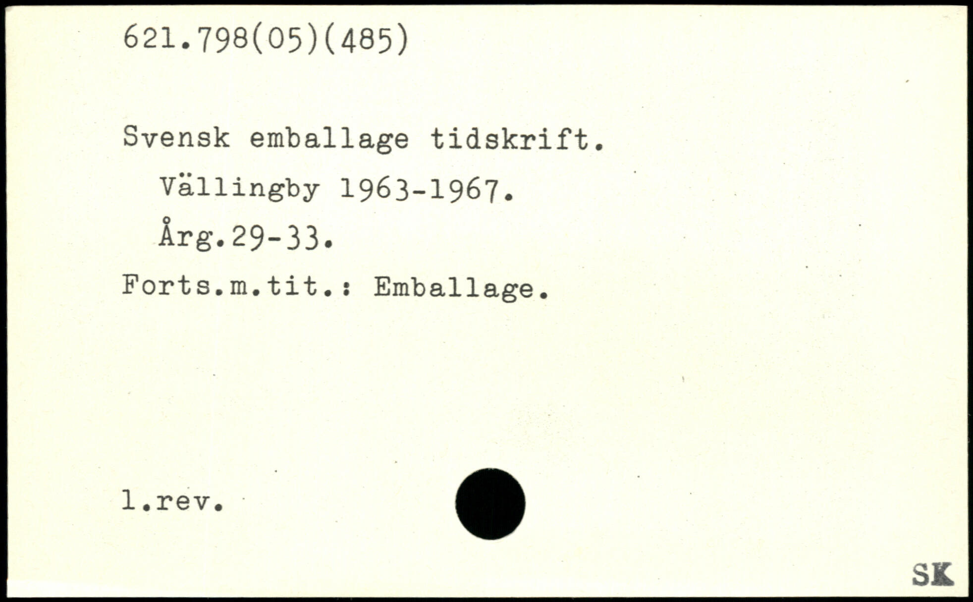 Svensk emballage tidskrift. Vällingby 1963-1967. Årg.29-33. Forts.m.tit.: Emballage.