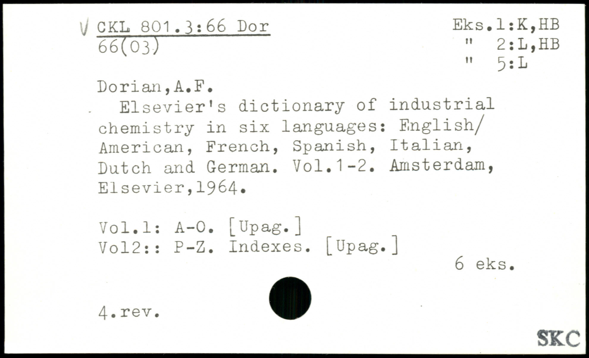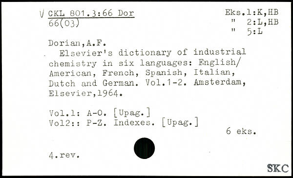 Elsevier's dictionary of industrial chemistry in six languages: English/ American, French, Spanish, Italian, Dutch and German. Vo1.1-2.