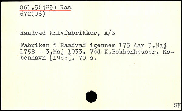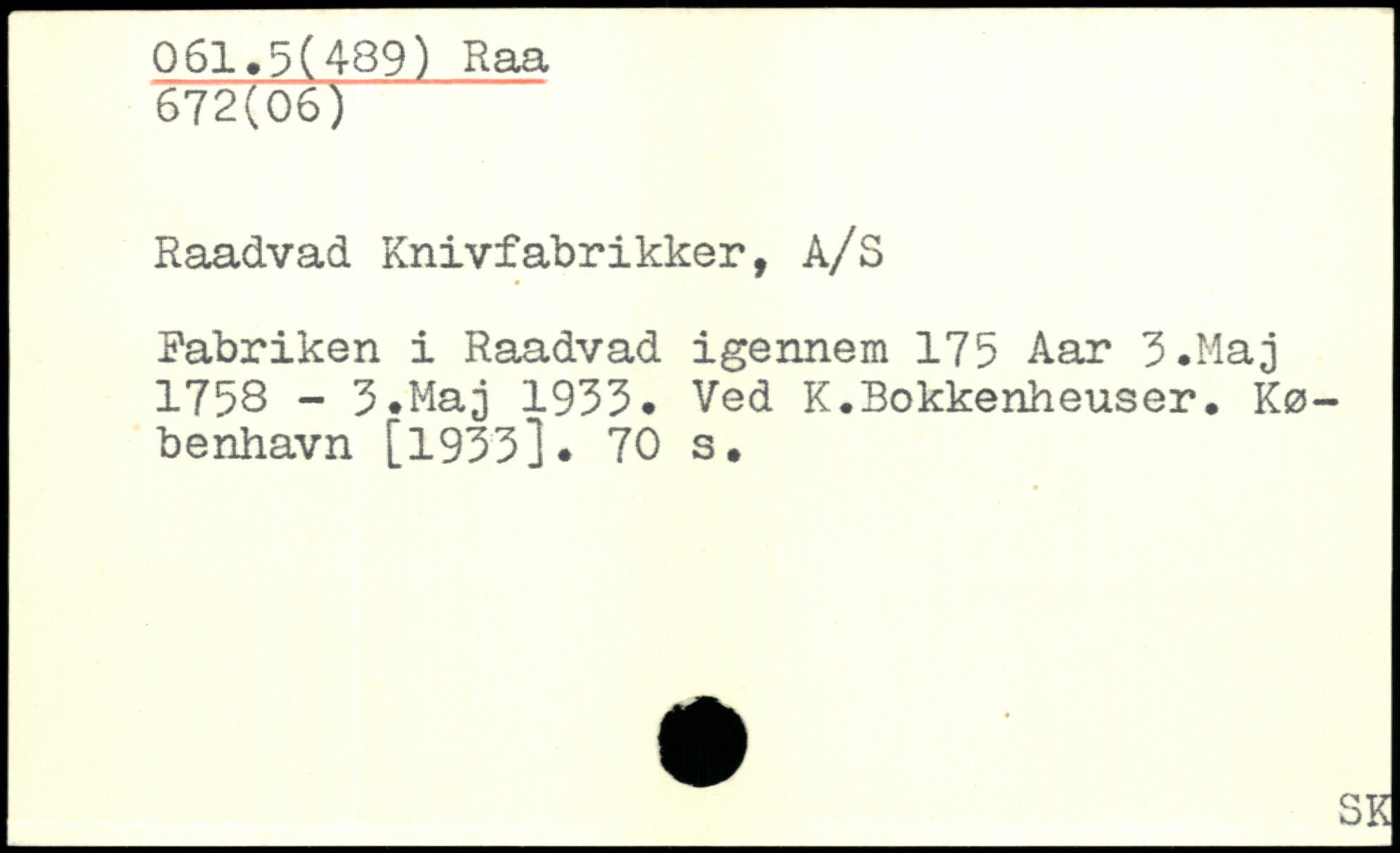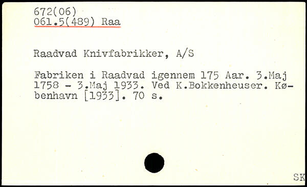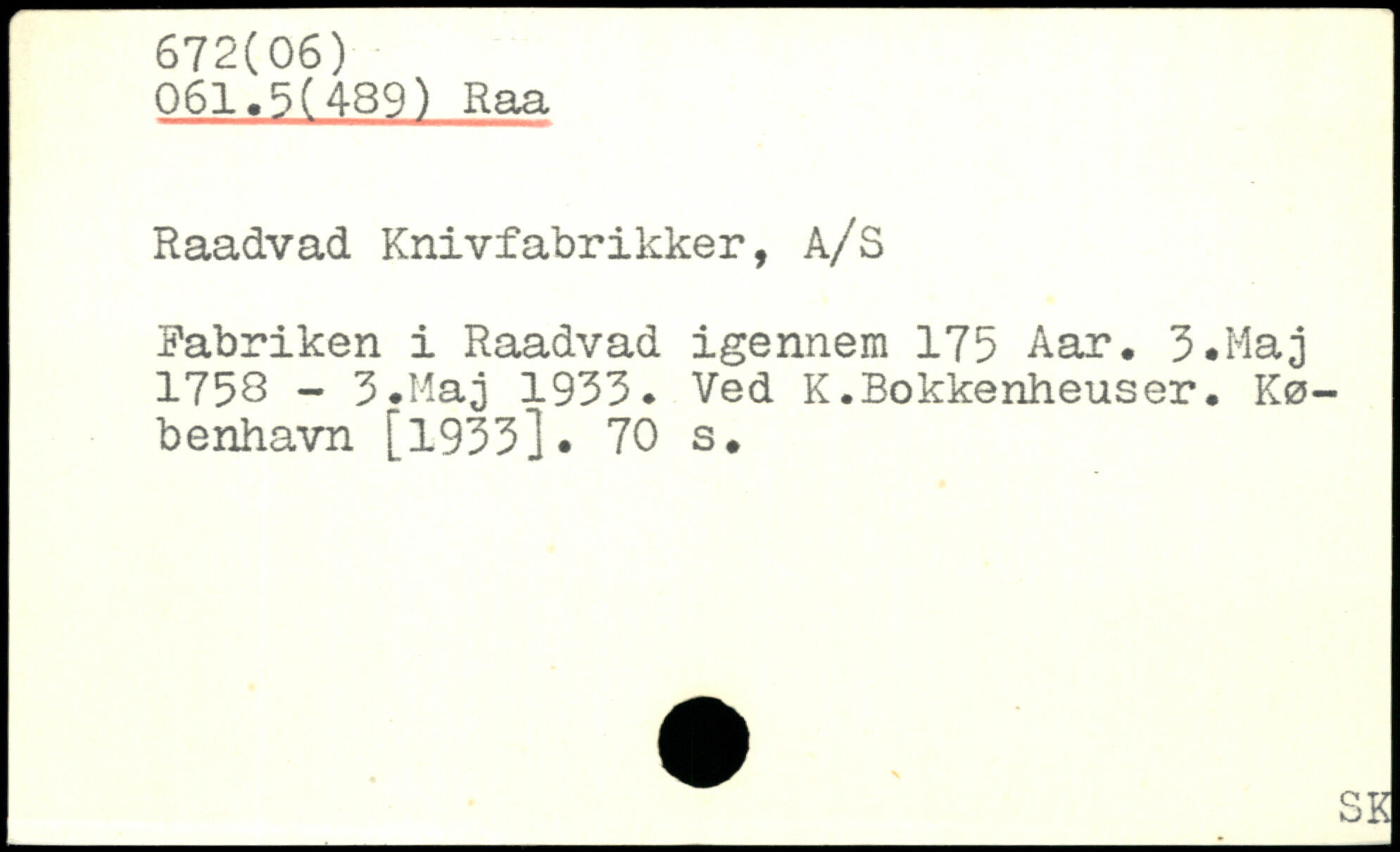 Raadvad Knivfabrikker, A/S Fabriken i Raadvad igennem 175 Aar 3.Maj 1758 - 3.Maj 1933. Ved K.Bokkenheuser.
