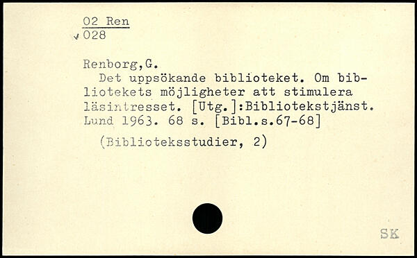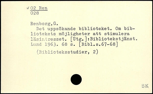 Det uppsökande biblioteket. Om bibliotekets möjligheter att stimulera läsintresset. [Utg.]:Bibliotekstjänst. Lund 1963.