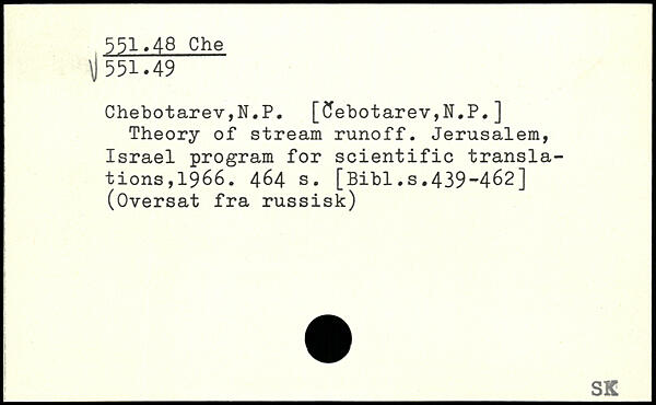 Chebotarev,N.P. [?ebotarev,N.P.] Theory of stream runoff. Jerusalem, Israel program for scientific translations, 1966.