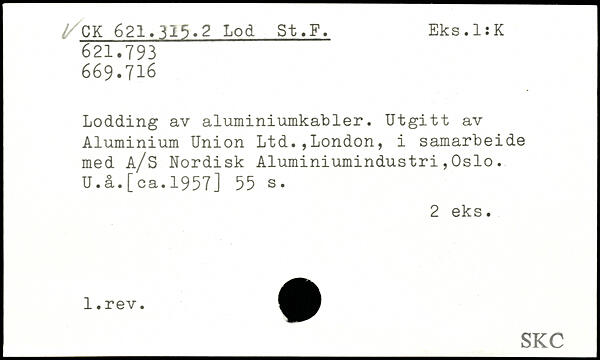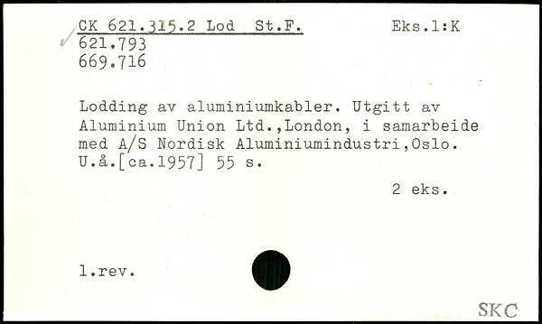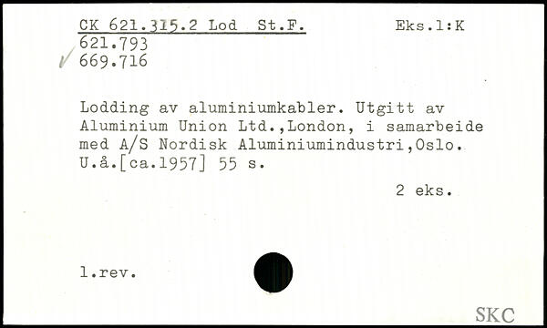 Lodding av aluminiumkabler. Utgitt av Aluminium Union Ltd.,London, i samarbeide med A/S Nordisk Aluminiumindustri,Oslo. U.ä.[ca.1957]