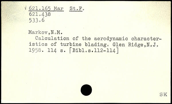 Calculation of the aerodynamic characteristics of turbine blading. Glen Ridge,N0Jo 1958.