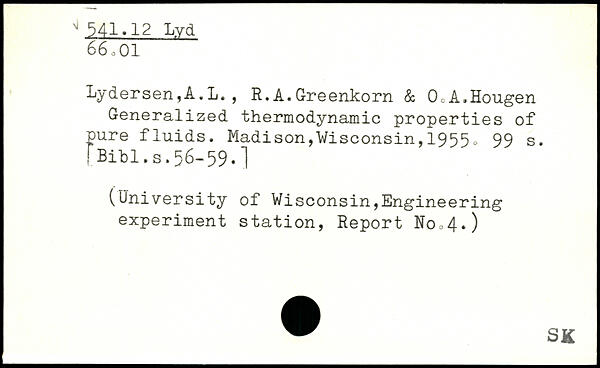 Lydersen,A.L., R.A.Greenkorn & 0.A,Hougen Generalized thermodynamic properties of pure fluids.