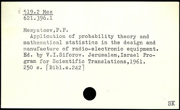 Application cf probability theory and mathematical statistics in the design and manufacture of radio-electronic equipment. Ed. by V.I.Siforov. Jerusalem,Israel Program for Scientific Translations,1961.