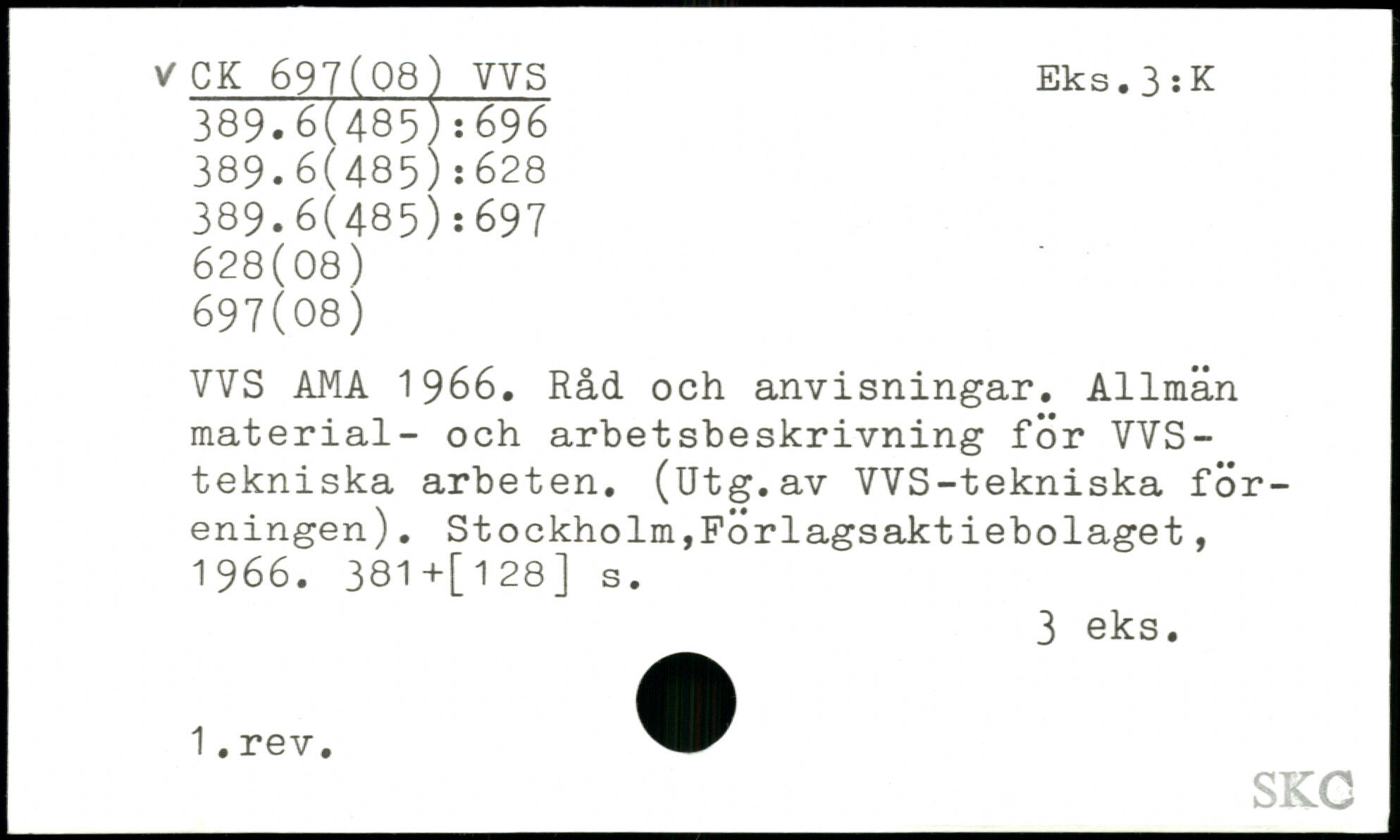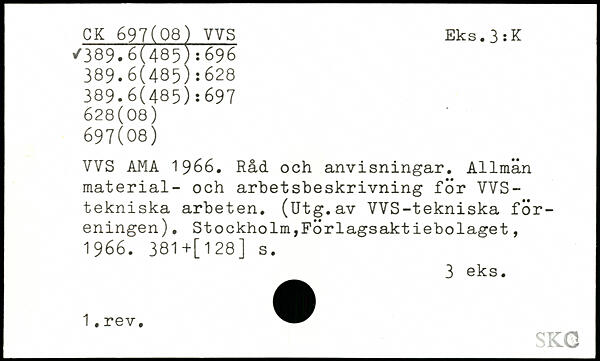 VVS AMA 1966. Råd och anvisningar. Allmän material- och arbetsbeskrivning för VVS-tekniska arbeten. (Utg.av VVS-tekniska föreningen). Stockholm,FÖrlagsaktiebolaget, 1966. 381+[128] s.