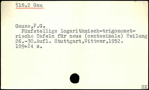 Gauss ,3?.Cr, Fünfstellige logaritiimiscii-trigonomet-rische Tafeln für neue (centésimale) Teilung 26.-