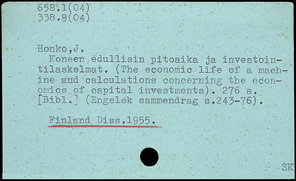 Koneen:edullisin pitoaika ja investoin-tilaskelmat. (The economic life of a machine and calculations concerning the economics of capital investments).