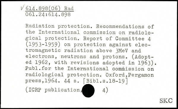 Radiation protection. Recommendations of the International commission on radiological protection. Report of Committee 4 (1953-1959) on protection against elec- I tromagnetic radiation above 3MeV and electrons, neutrons and protons. (Adopted 1962, with revisions adopted in 1963). Publ.for the International commission on radiological protection.