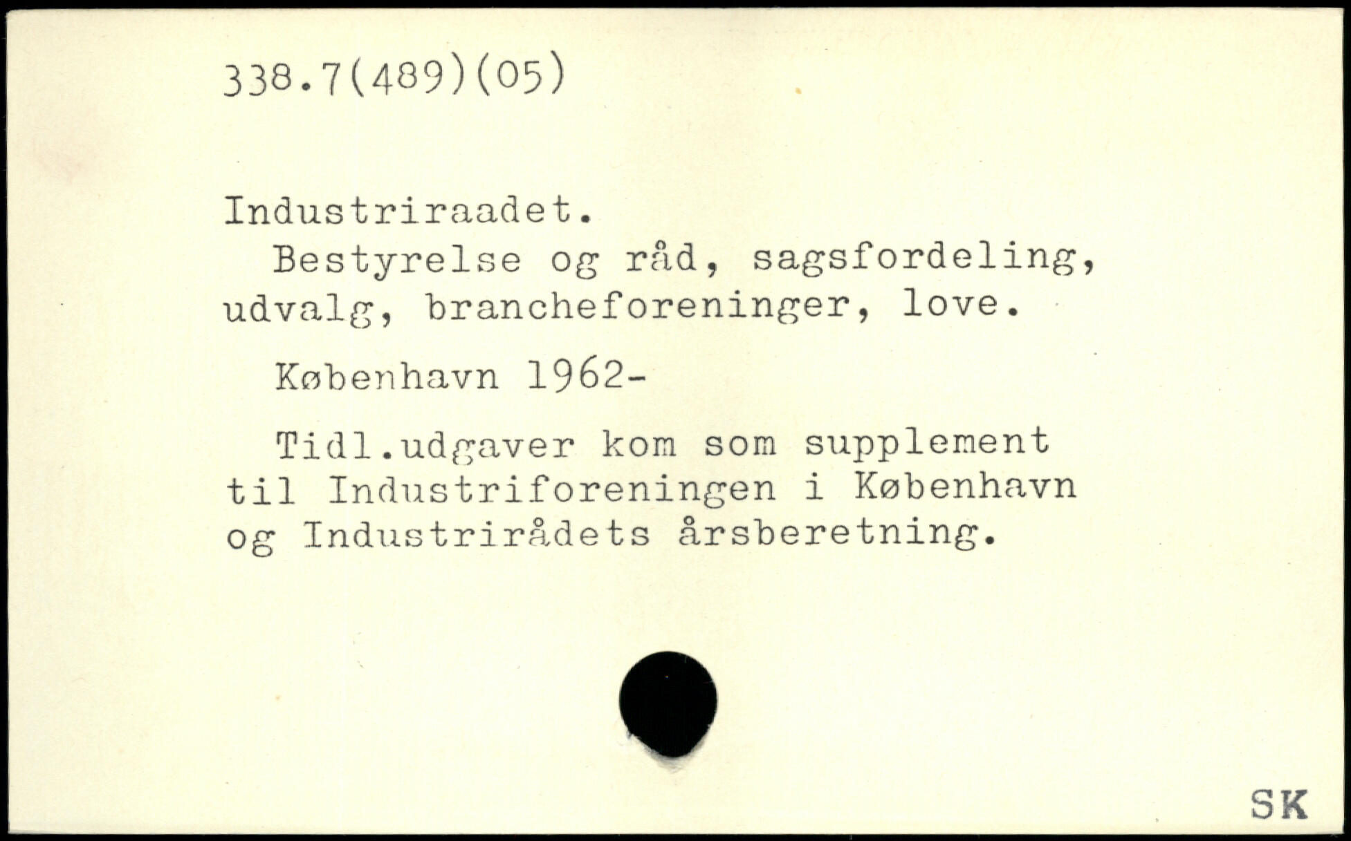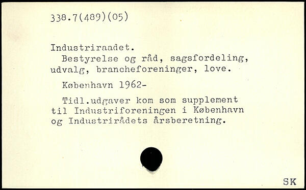 Bestyrelse og råd, sagsfordeling, udvalg, brancheforeninger, love. Kobenhavn 1962- Tidl.udgaver kom som supplement til Industriforeningen i København og Industrirådets årsberetning.