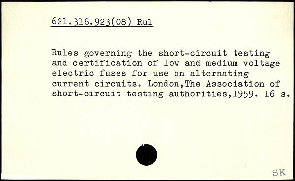Rules governing the short-circuit testing and certification of low and medium voltage electric fuses for use on alternating current circuits. London,The Association of short-circuit testing authorities,1959