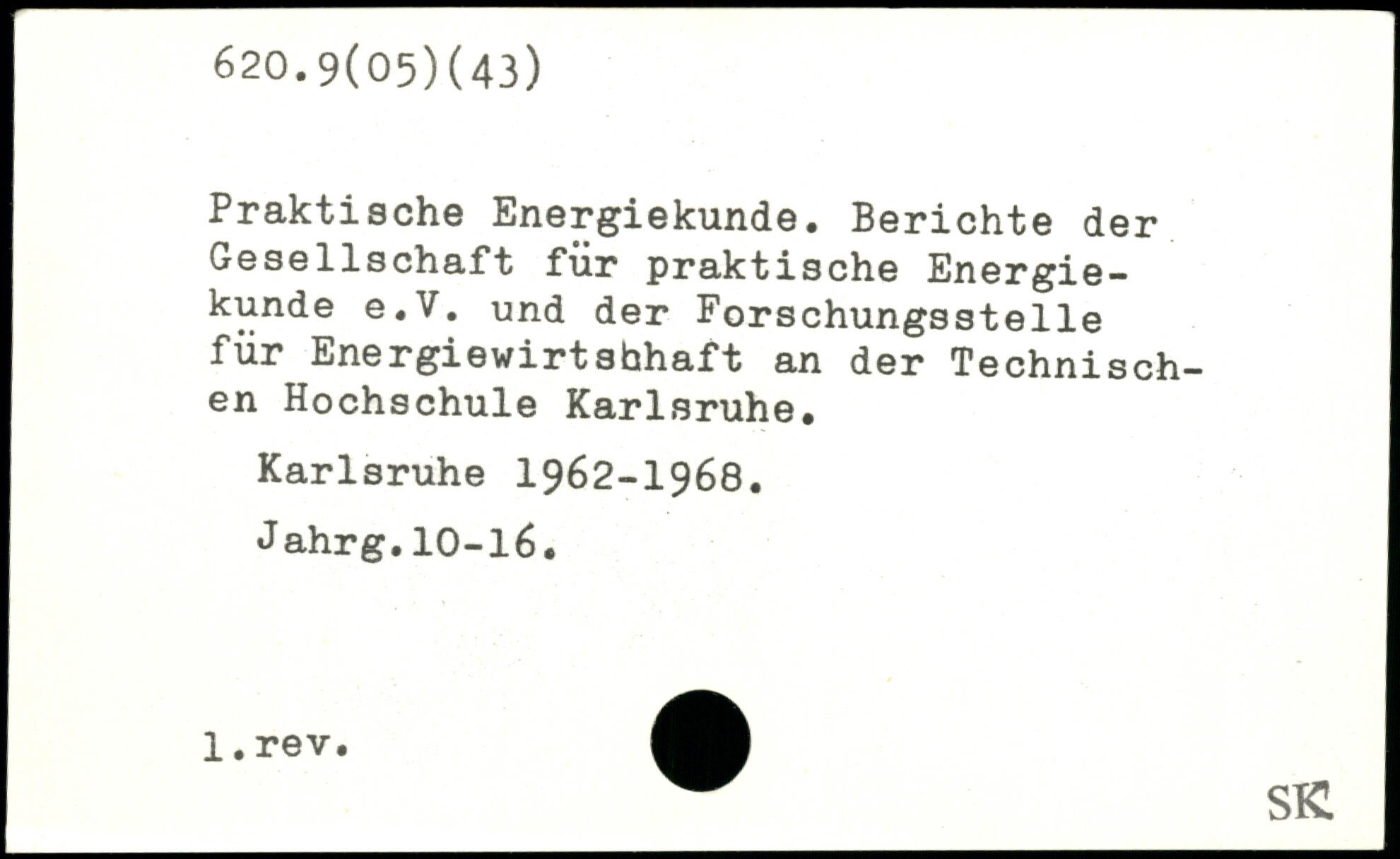 Praktische Energiekunde. Berichte der Gesellschaft für praktische Energiekunde e.V. und der Forschungsstelle für Energiewirtsbhaft an der Technischen Hochschule Karlsruhe, Karlsruhe 1962-1968. J ahrg.10-16. W SK
