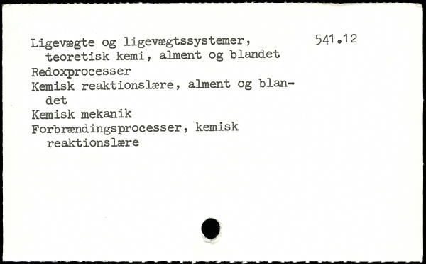 Ligevægte og ligevægtssystemer, 541.12 teoretisk kemi, alment og blandet Redoxprocesser Kemisk reaktionslære, alment og blandet Kemisk mekanik Forbrændingsprocesser, kemisk reaktionslære