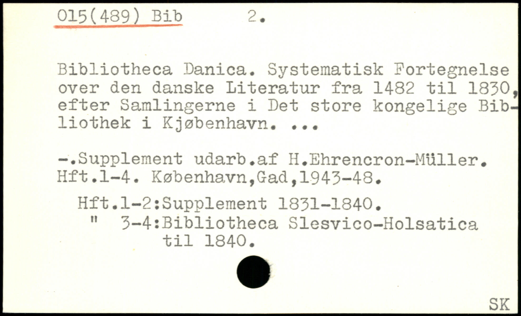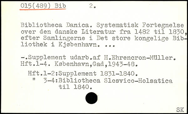 Bibliotheca Danica. Systematisk Portegneise over den danske Literatur fra 1482 til 1830, efter Samlingerne i Det store kongelige Bibliothek i Kjøbenhavn. ... -.Supplement udarb.af H.Ehrencron-Muller. Hft.1-4.