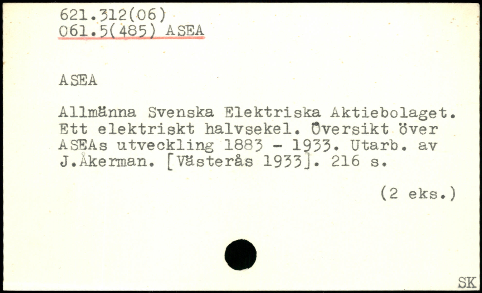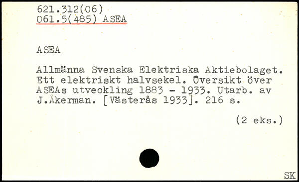 Allmänna Svenska Elektriska Aktiebolaget. Ett elektriskt halvsekel. Översikt över ASEAs utveckling 1883 - 1933. Utarb. av J.Åkerman.