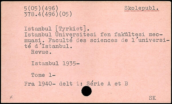 Istanbul [Tyrkiet]. Istanbul Universitesi fen fakttltesi mec-muasi. Faculté des sciences de l'université d'Istanbul. Revue. Istanbul 1935-Tome 1- Fra 1940- delt i: Série A et B. ^ SK
