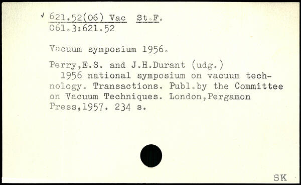 Vacmun symposium 1956. Perry,E.So and JoH.Durant (udg.) 1956 national symposium on vacuum technology. Transactions.