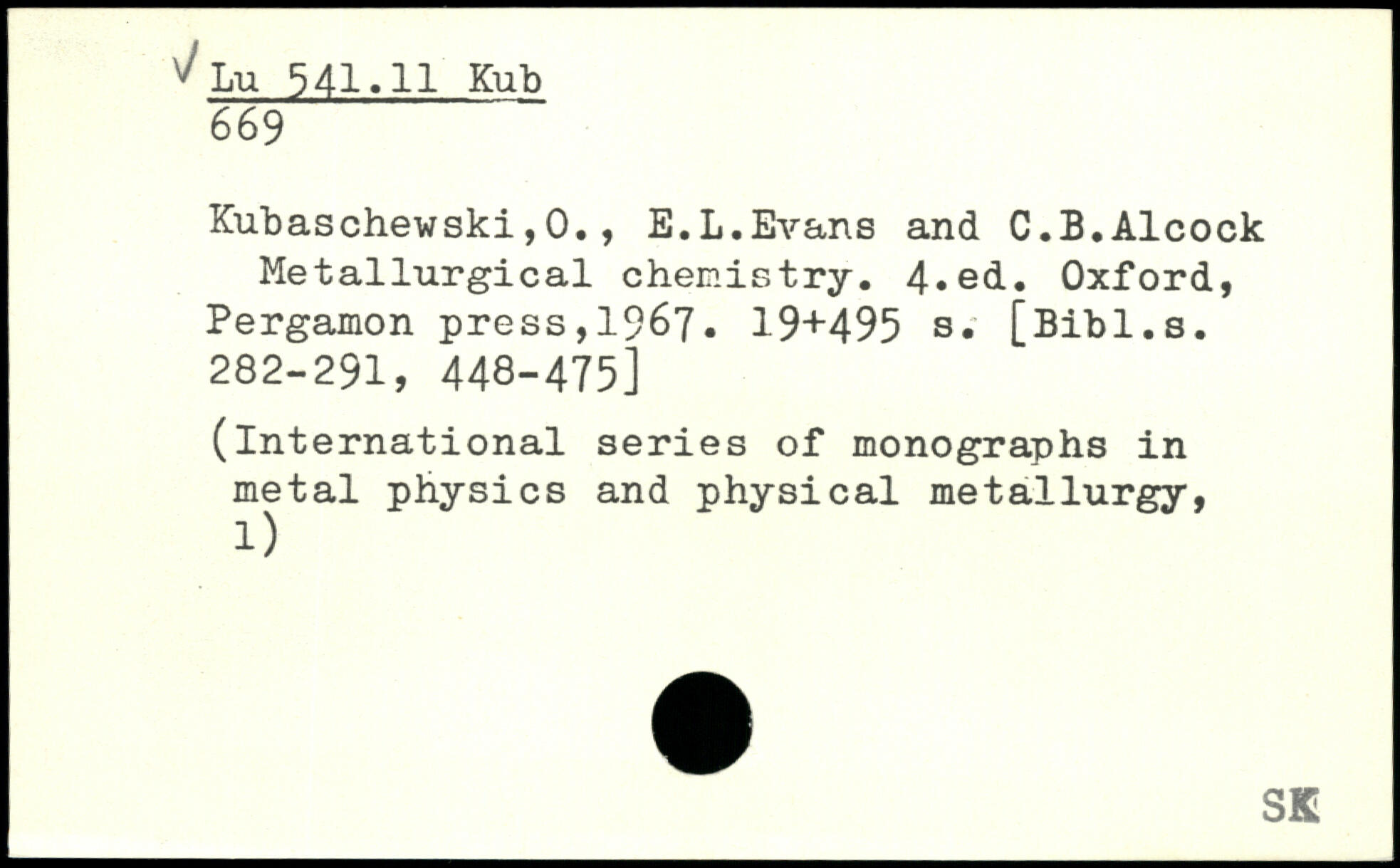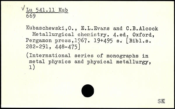 Kubaschewski,0., E.L.Evans and C.B.Alcock Metallurgical chemistry.
