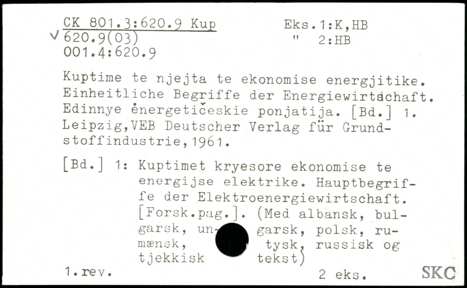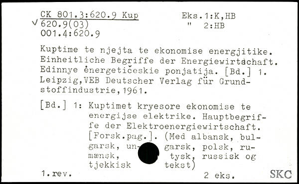 Kuptime te njejta te ekonomise energjitike. Einheitliche Begriffe der Energiewirtdchaft. Edinnye énergeticeskie ponjatija. [Bd.] 1. Leipzig,VEB Deutscher Verlag für Grundstoffindustrie, 1961. [Bd.] 1: Kuptimet kryesore ekonomise te energi j se elektrike. Haupthegriffe der Elektroenergiewirtschaft.