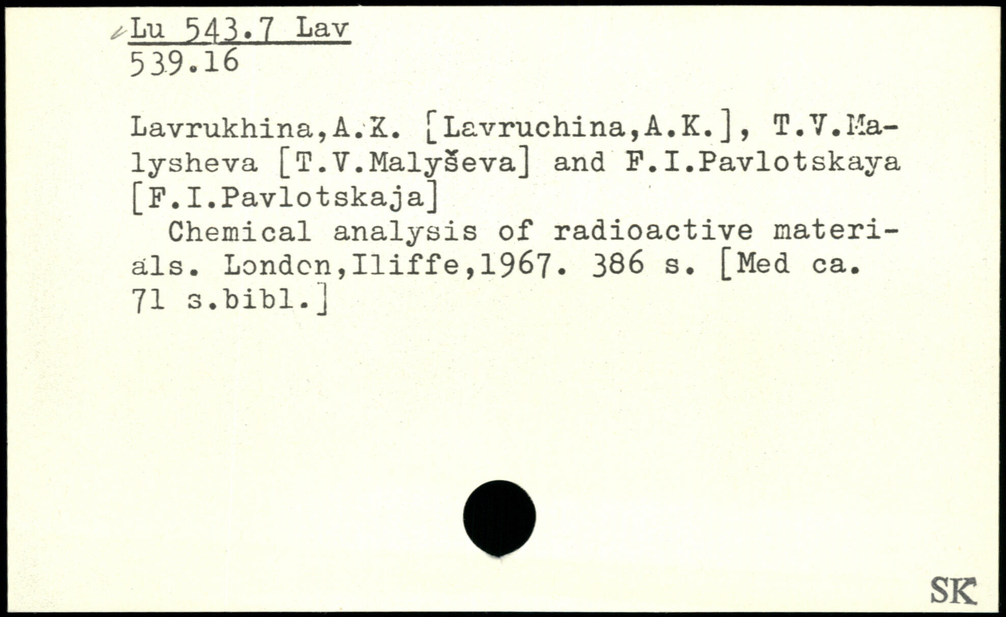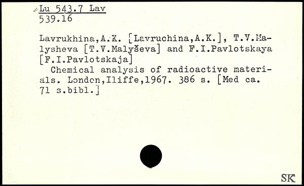 Lavrukhina,A.X. [Lavruchina,A.K.], T.Y.Malysheva [T.V.Malyseva] and F.I.Pavlotskaya [F.I.Pavlotskaja] Chemical analysis of radioactive materials.