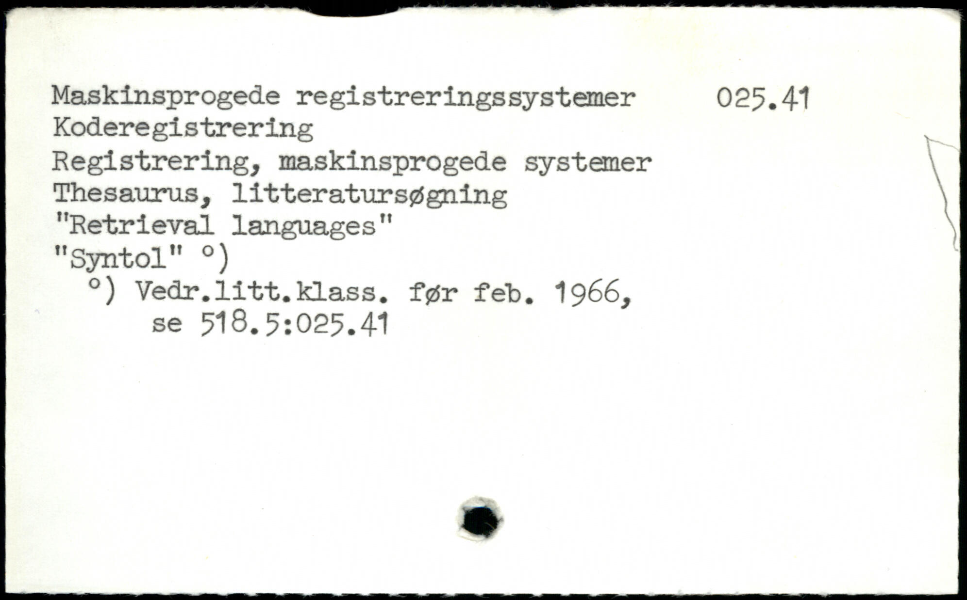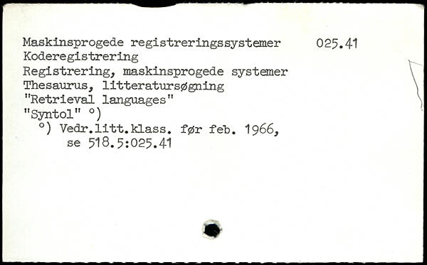 Masklnsprogede registreringssystemer 025.41 Koderegistrering Registrering, maskinsprogede systemer Thesaurus, litteratursøgning \ "Retrieval languages" ) "Syntol" .) .) Vedr.litt.klass. før feh. 1966, se 518.5:025.41