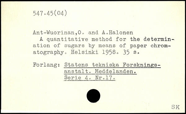 Ant~Wuor.inan,0o and A,Halonen A quantitative method for the determination of sugars "by means of paper chromatography,