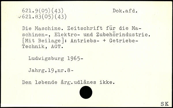 Die Maschine. Zeitschrift für die Maschinen-, Elektro- und Zubehörindustrie. [Mit Beilage]: Antriebs- + Getriebe-Technik, AGT. Ludwigsburg 1965- Jahrg.19,nr. 8- Den løbende årg.udlånes ikke. ______