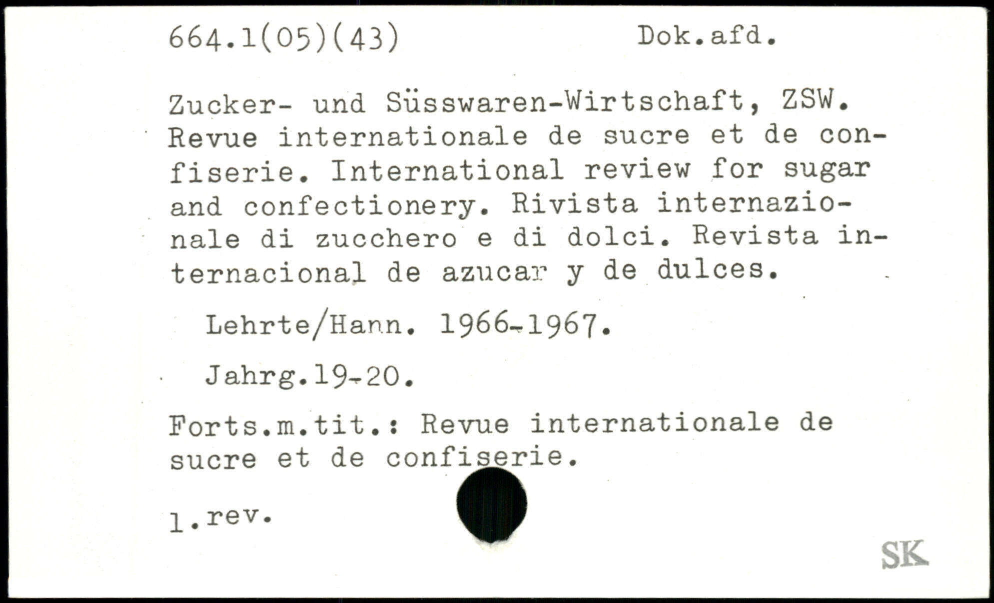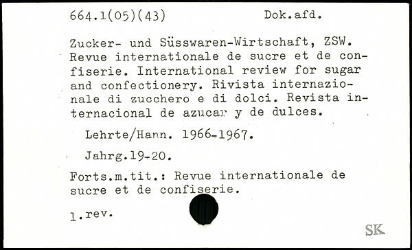 Zucker- und Siisswaren-Wir tschaft, ZSW. Revue internationale de sucre et de con-fiserie. International review for sugar and confectionery. Rivista internazio-nale di zucchero e di dolci. Revista in-ternacional de azucar y de dulces. Lehrte/Hann. 1966-1967, Jahrg.19-20. Forts.m.tit.: Revue internationale de sucre et de confiserie.