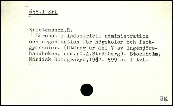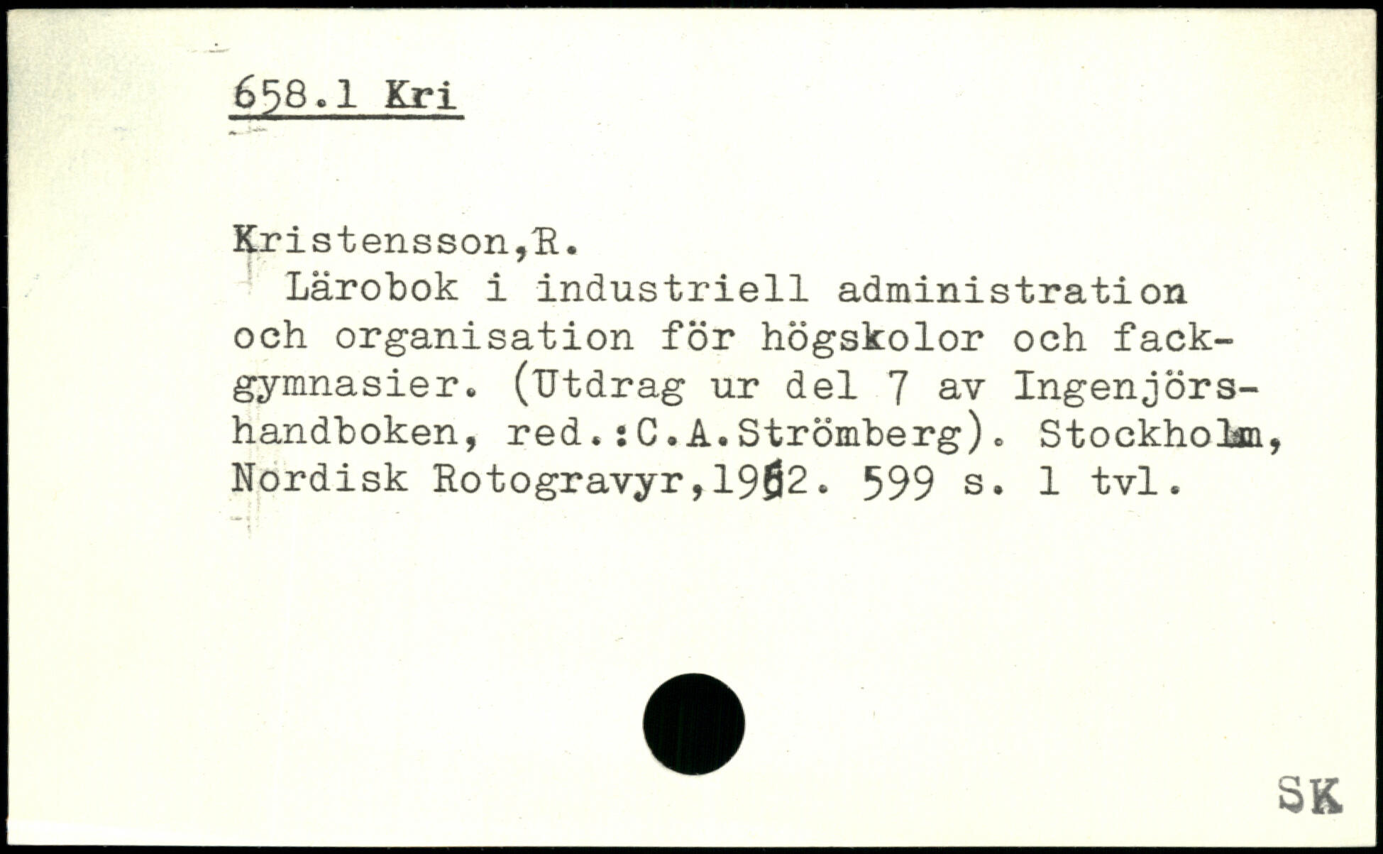 Lärobok i industriell administration och organisation för högskolor och fackgymnasier. (Utdrag ur del 7 av Ingenjörs-handboken, red.: C.A.Strömberg). Stockholm, Nordisk Rotogravyr,19^2.