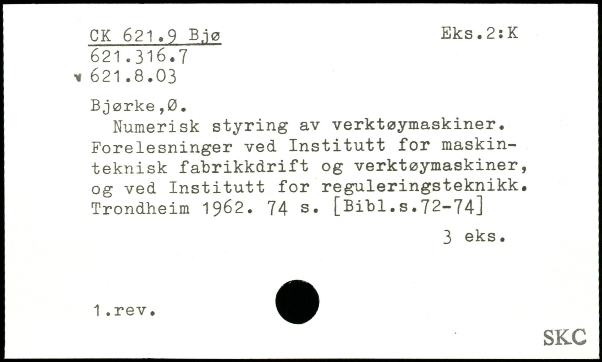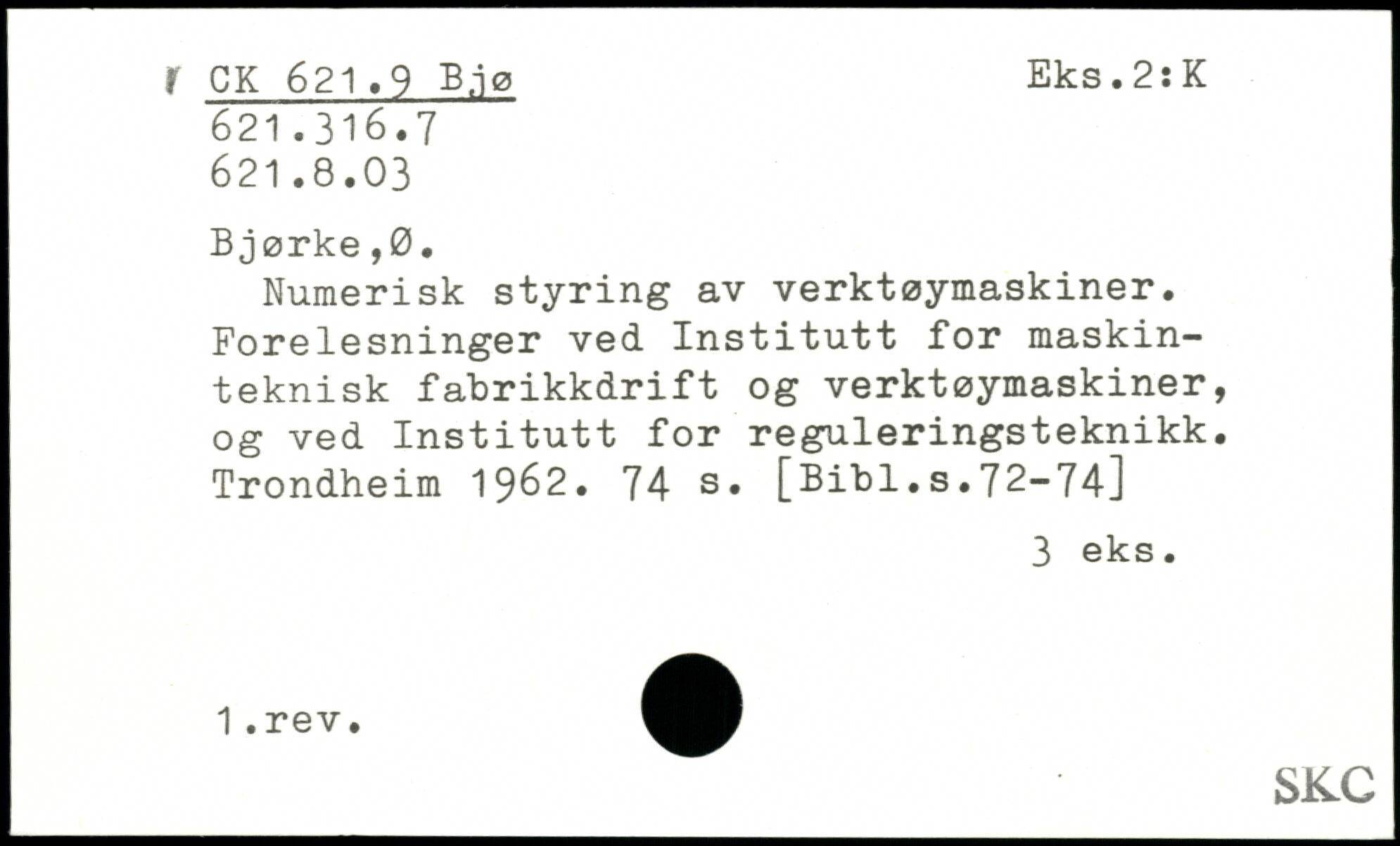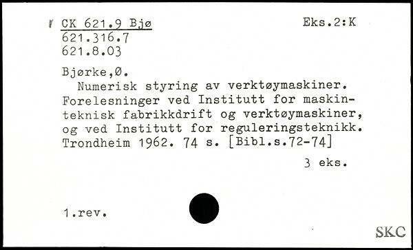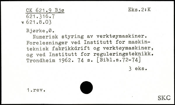 Numerisk styring av verktøymaskiner. Forelesninger ved Institutt for maskinteknisk fabrikkdrift og verktøymaskiner, og ved Institutt for reguleringsteknikk.