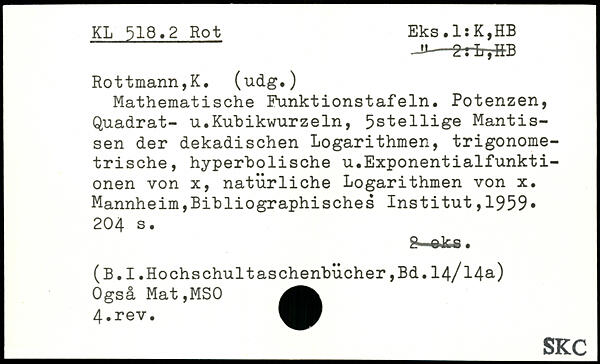 Mathematische Funktionstafeln. Potenzen, Quadrat- u.Kubikwurzeln, ^stellige Mantissen der dekadischen Logarithmen, trigonometrische, hyperbolische u.Exponentialfunktionen von x, natürliche Logarithmen von x.